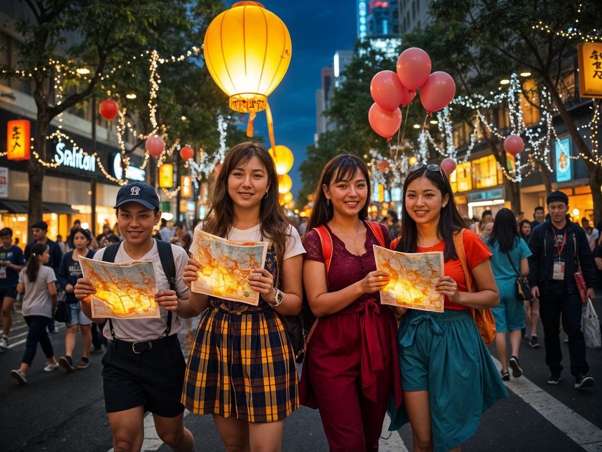 Scavenger Hunt Night — Cinematic Focus on One Group Foreground (Main Group): A team of four friends is at the center of the frame, clutching brightly coloured maps that glow faintly under lantern light. Each person has a distinct personality reflected in their attire: one wears a playful hat, another ...