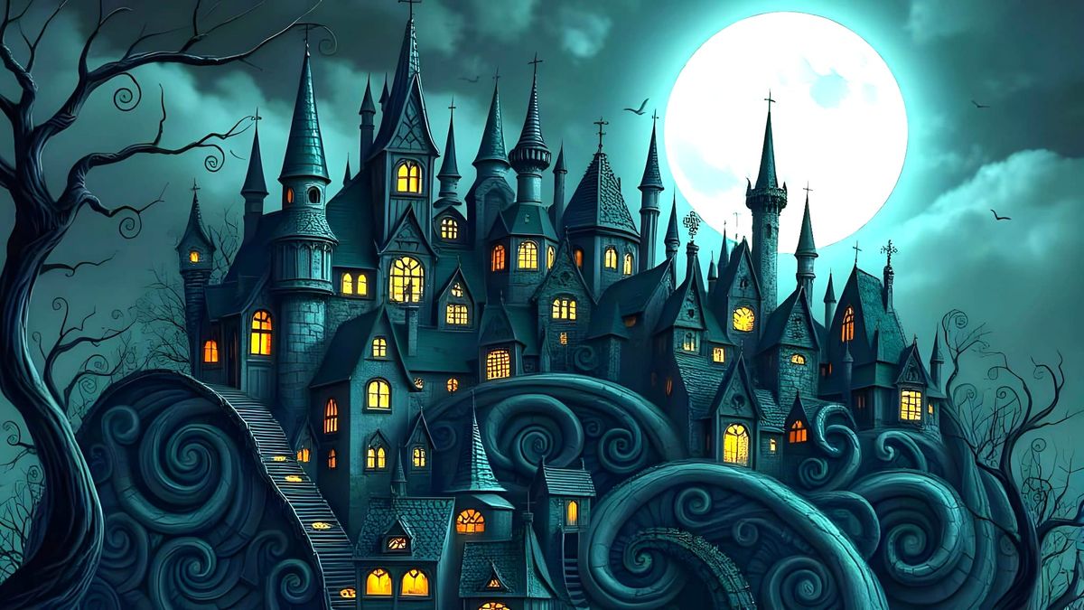 A whimsical gothic village winds up a hill, with spirals covering every surface. The image evokes a gothic whimsical style.