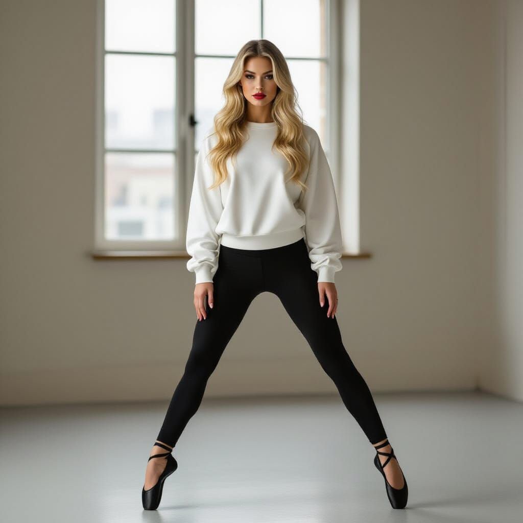 This image shows a blonde woman en pointe in ballet shoes, wearing a white silk sweatshirt and black leggings. The photorealistic image captures a strict and dominant presence with bold makeup.