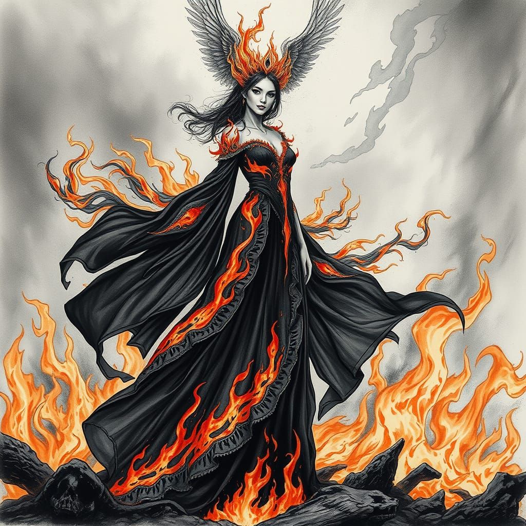 This image depicts a powerful female figure standing amidst a blazing inferno, adorned with intricate flames on her flowing black dress, rendered in a dark, expressive charcoal drawing style reminiscent of hyper-realistic artwork.