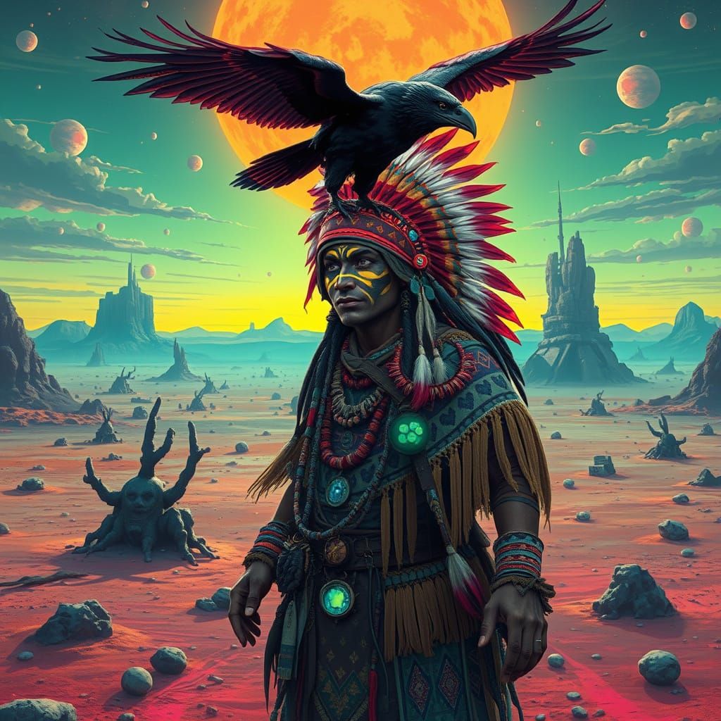 This image depicts a Native American shaman in a barren alien landscape. The shaman, adorned with glowing tribal markings and traditional clothing, is summoning a spectral raven in a surrealist style.