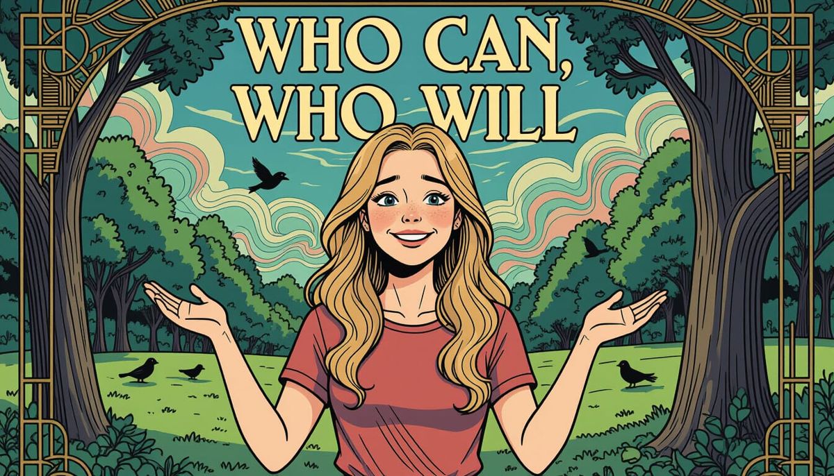 This image shows a young woman with long blonde hair at a park, under Art Deco text. The scene blends detailed linework with futuristic and surreal elements in muted, soft colors.