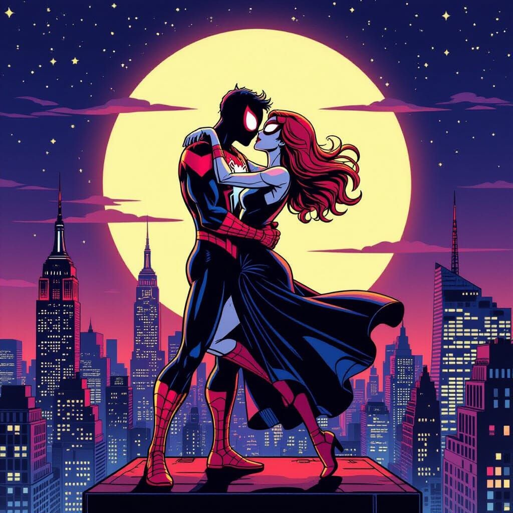 This image depicts Spider-Man and Ghost-Spider in a romantic dance atop a New York City skyscraper, illuminated by neon lights. Created in a vibrant retro comic art style.
