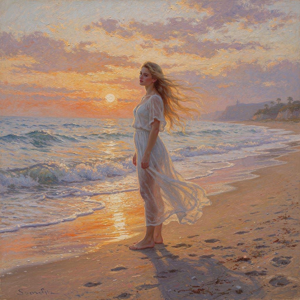 This image shows a young woman with flowing blonde hair on a sandy beach during a sunset. Rendered in a romantic, impressionistic oil painting style, it features soft brushstrokes and a rich color palette emphasizing light and atmosphere.