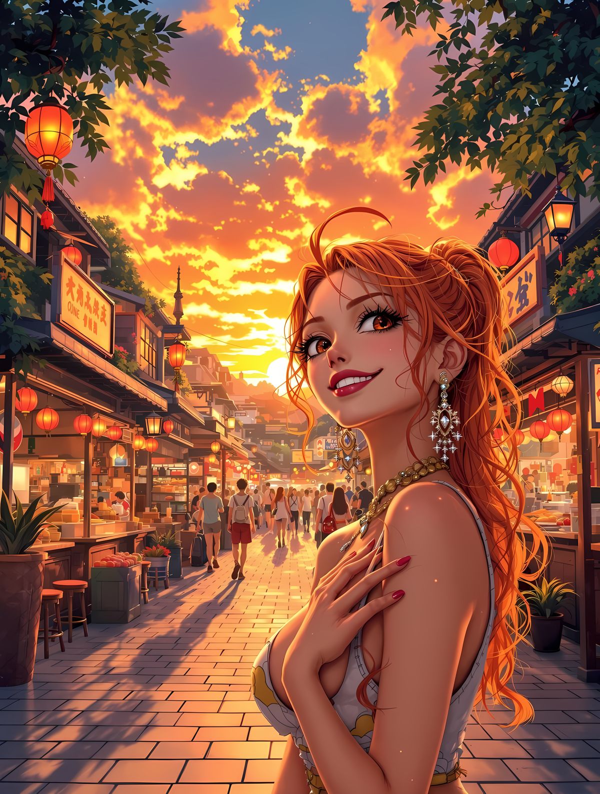 This image captures Nami from One Piece at a lively summer festival, enjoying the warm sunset and vibrant atmosphere. Her slender build and captivating eyes are highlighted in a detailed, acrylic illustration reminiscent of Artgerm's style, with rich colors and intricate details.