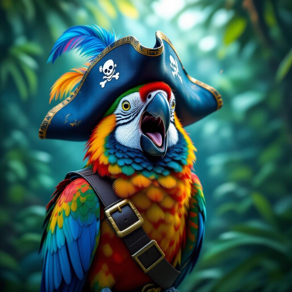 A vivid image of a parrot wearing a pirate hat and screaming in a jungle. The artwork features deep blues and yellows, intricate feather textures, and a fantasy art style.