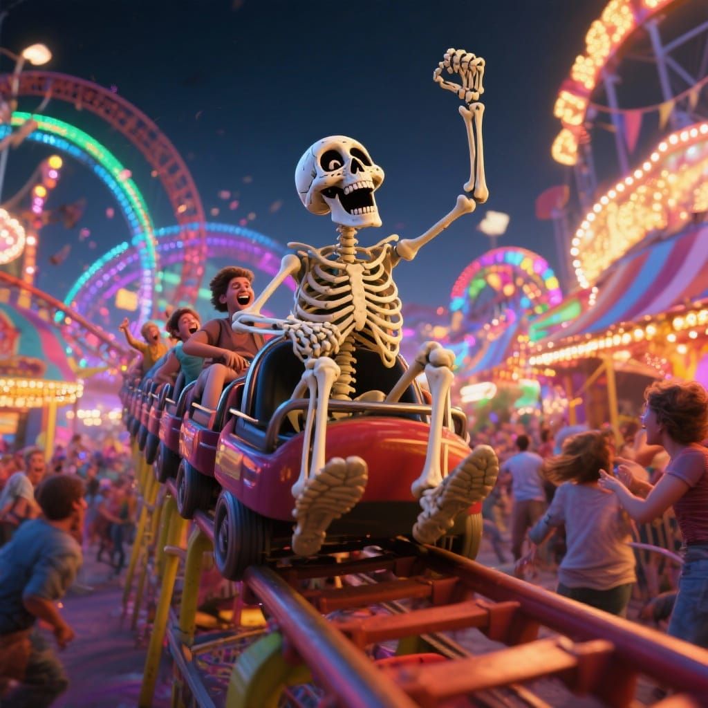 Make your own fun skeleton images in a theme park with our free AI generator. Easy and fast!