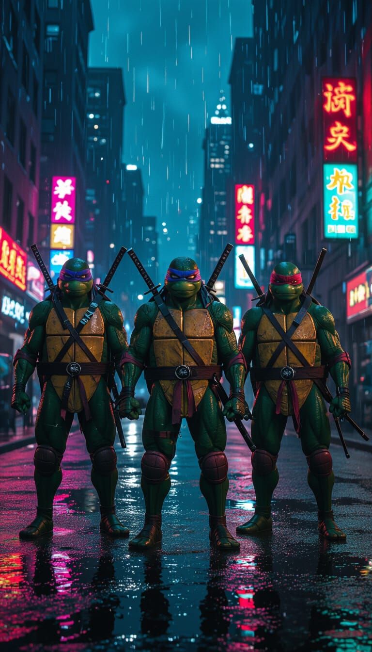 This image shows the Ninja Turtles and Master Splinter confronting Leatherhead on rain-slicked New York City streets. The scene is presented with cinematic lighting and high resolution, in a dark, gritty, ultra-realistic style.
