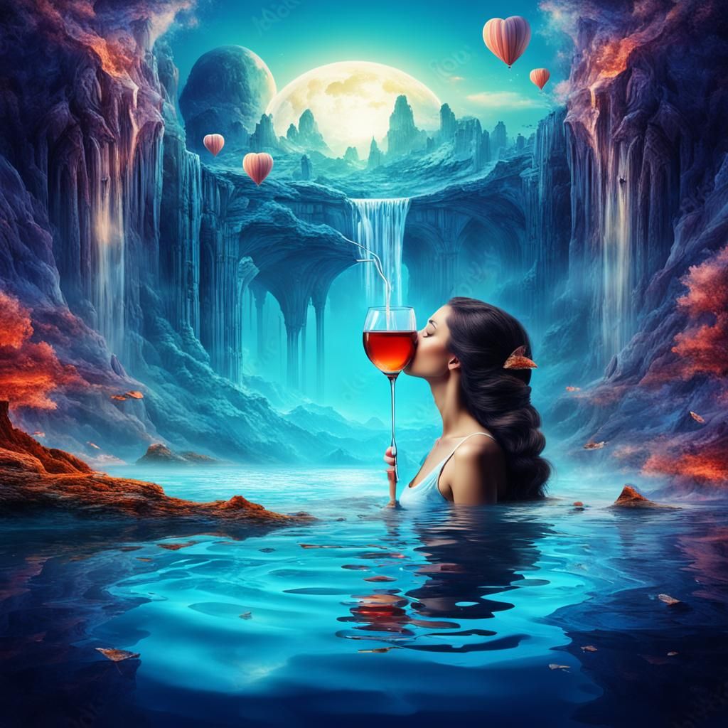 A surreal image of a woman and a drink blend into an abstract fantasy landscape. The background is a mix of vivid colors and dreamlike scenery.