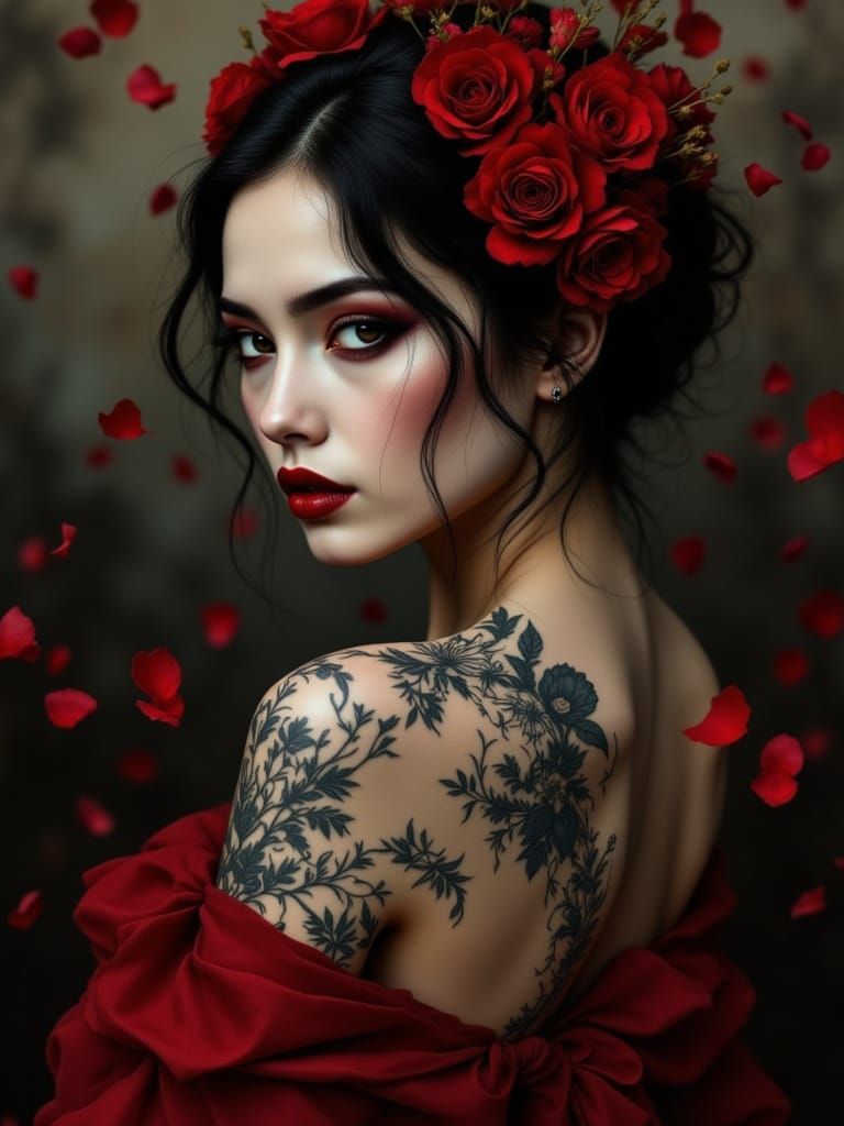A pale woman with intense makeup and red flowers in her hair gazes piercingly from a surreal twilight floral setting, rendered with dark romantic surrealism and painterly flair.