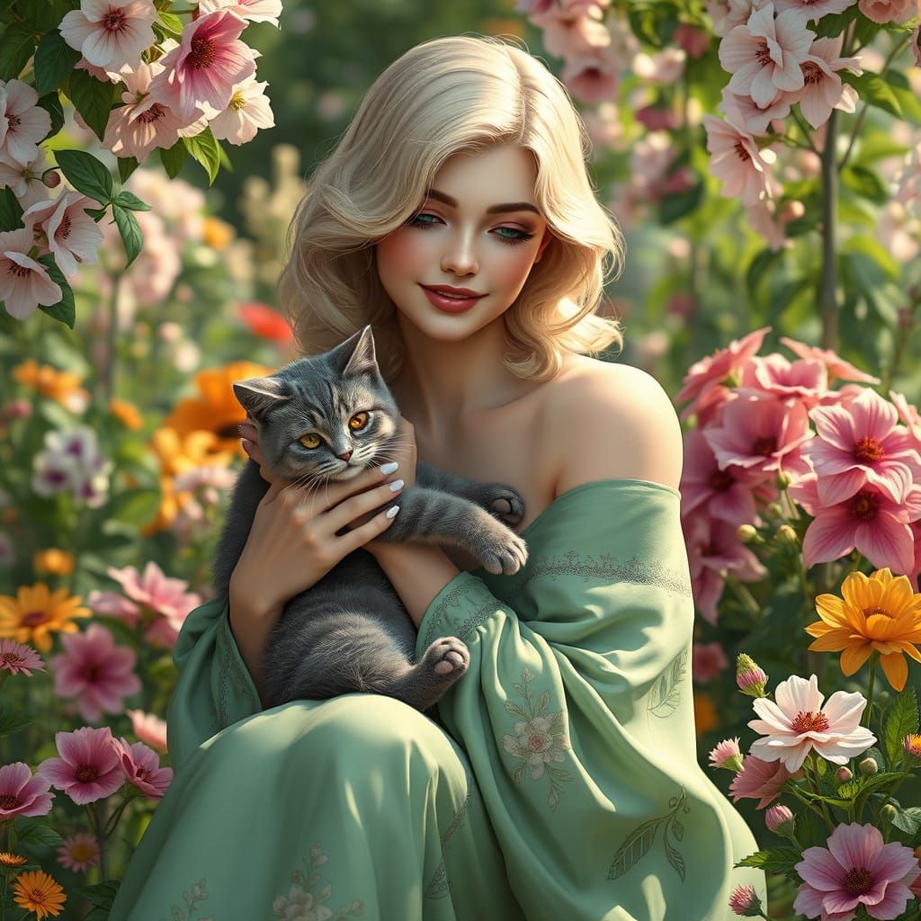 A portrait of a serene European woman with blonde, wavy hair, surrounded by lush greenery and colorful flowers, gently holding a light gray kitten. She wears a delicate, floral-patterned green dress, adorned with fine lace, in a dynamic, 8k resolution concept art piece inspired by the styles of Greg Rutk...