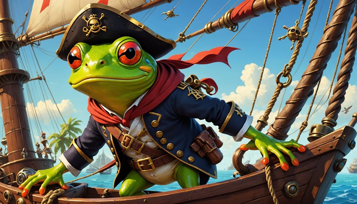 This image shows a vibrant green tree frog pirate captain leaping from ship rigging towards treasure. The scene is rendered in a detailed, expressive Pixar animation style with dramatic lighting and rich textures.