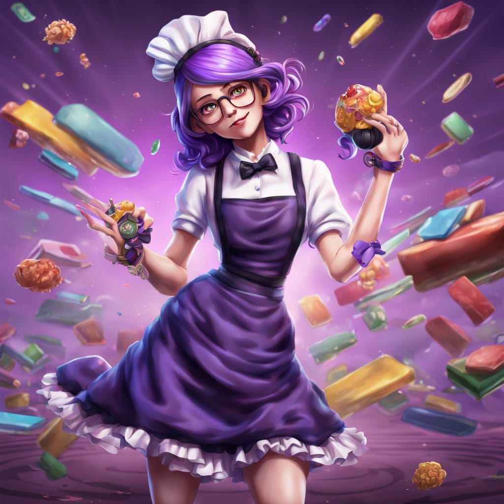 A mature, feminine virtual mom with purple hair and a maid-like dress, showcasing her legs and wearing oxfords, in a dramatic, hyperrealistic concept art piece with intricate details and a colorful background