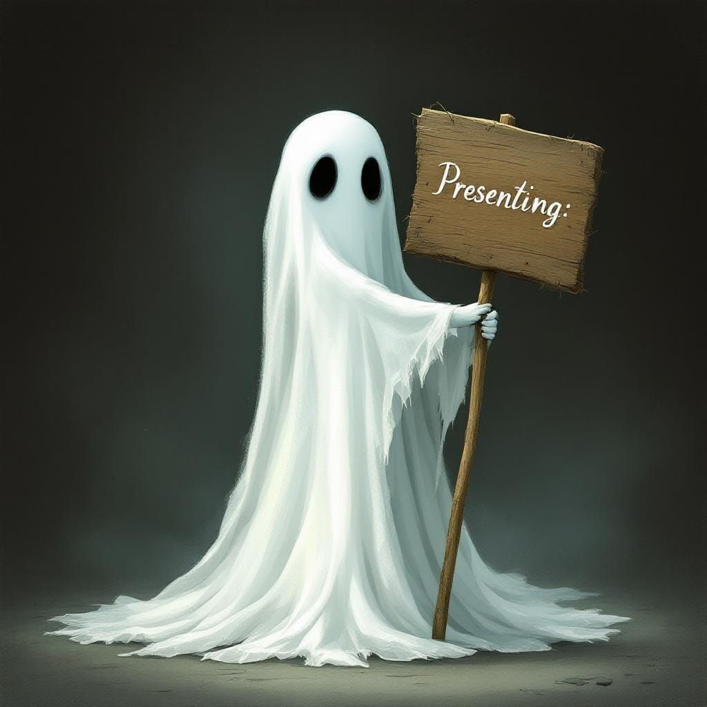 This image shows a cute ghost in a white gown holding a sign. The artwork features a dark, mystical background and muted colors, creating a spooky yet soft aesthetic.