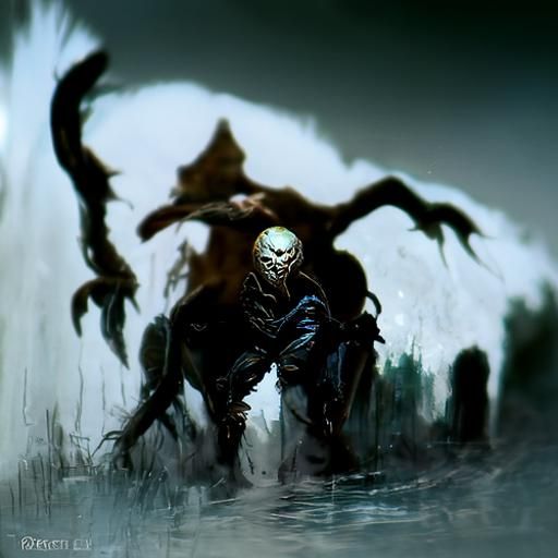 This image shows a sinister depiction of Pumpkinhead. The artwork captures a menacing presence with detailed textures and dramatic lighting reminiscent of dark fantasy art.