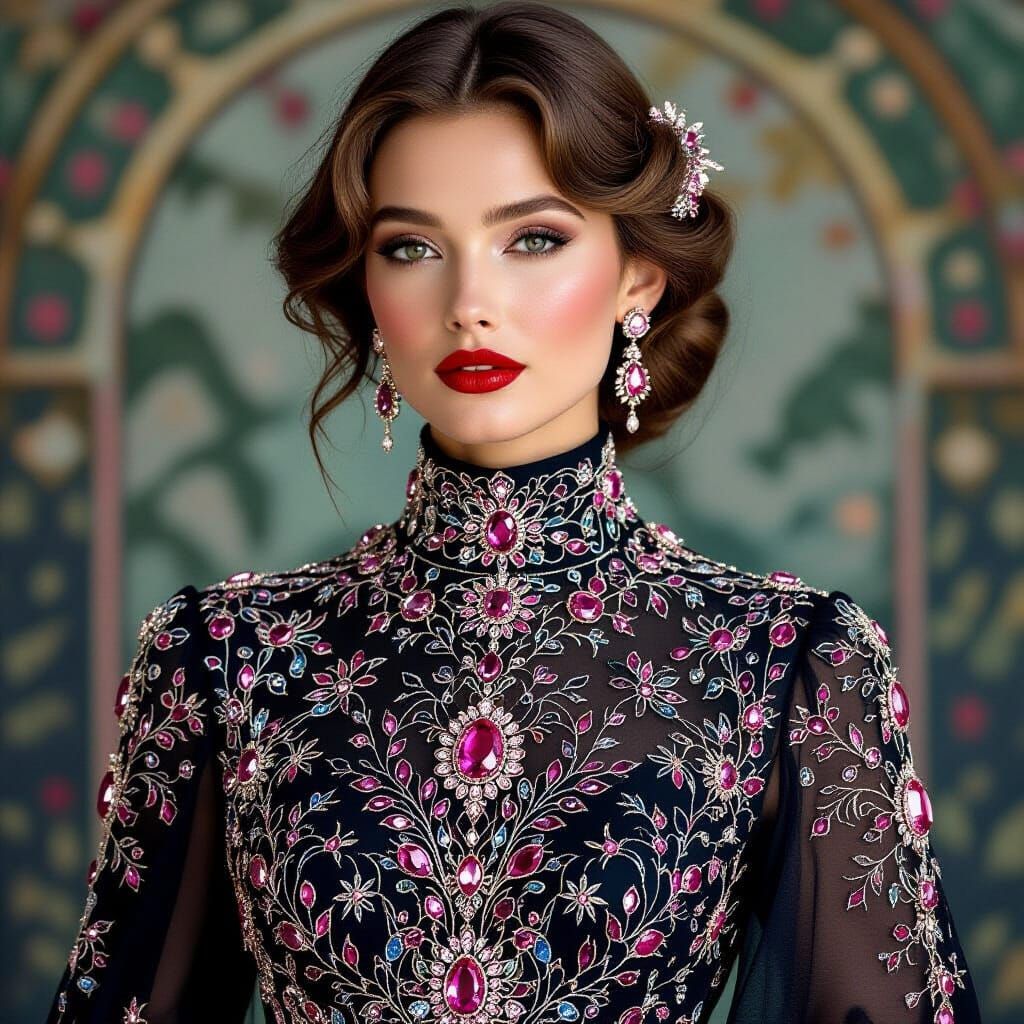 This image depicts a woman in an opulent, gem-encrusted gown. The artwork evokes the style of Art Nouveau, with a blend of luxurious and elegant design elements.