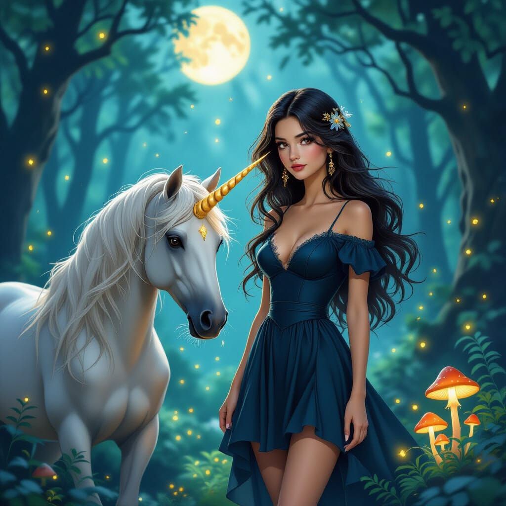 This image depicts a beautiful witch and a golden unicorn in a moonlit enchanted forest. The scene is illuminated by fireflies and glowing mushrooms, rendered in a detailed digital painting style with romantic fantasy illustration elements.