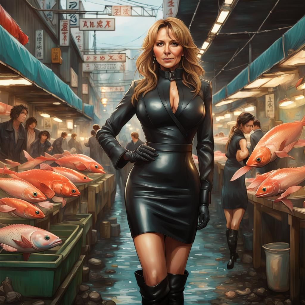 A hyperdetailed image of a woman in a black leather dress and boots at a Japanese fish market. The digital art features dynamic lighting, volumetric effects and triadic colors.