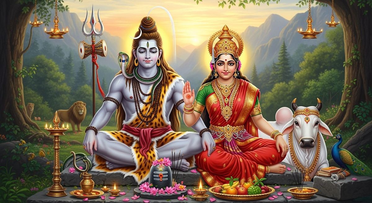A striking picture of Shiva and Parvati seated on a stone platform in a serene forest temple. The artwork is rich with detail, rendered in hyper-realistic style with divine light, and sacred aura.