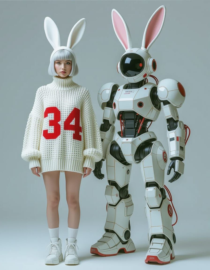 This image shows a high-fashion studio portrait of a woman with silver hair and rabbit ears alongside a retro-futuristic mecha. The shot uses cinematic lighting and captures detailed textures.