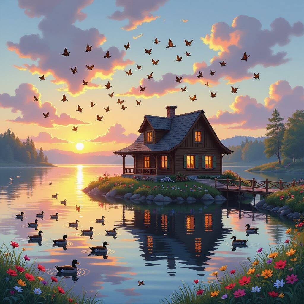 This image shows a quaint wooden house on a tiny island in a butterfly-filled lake at sunrise. Ducks take flight amidst thousands of butterflies in a luminous, hyperrealistic style.