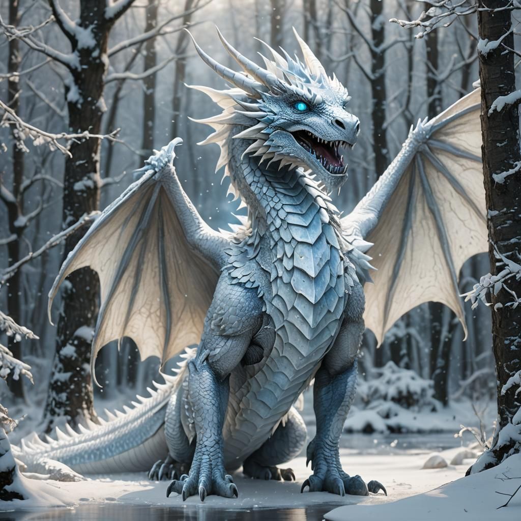 A majestic white dragon soars over a snow-covered lake in a winter forest. This digital painting features intricate details, a dramatic atmosphere, and a captivating blend of blue and white colors.