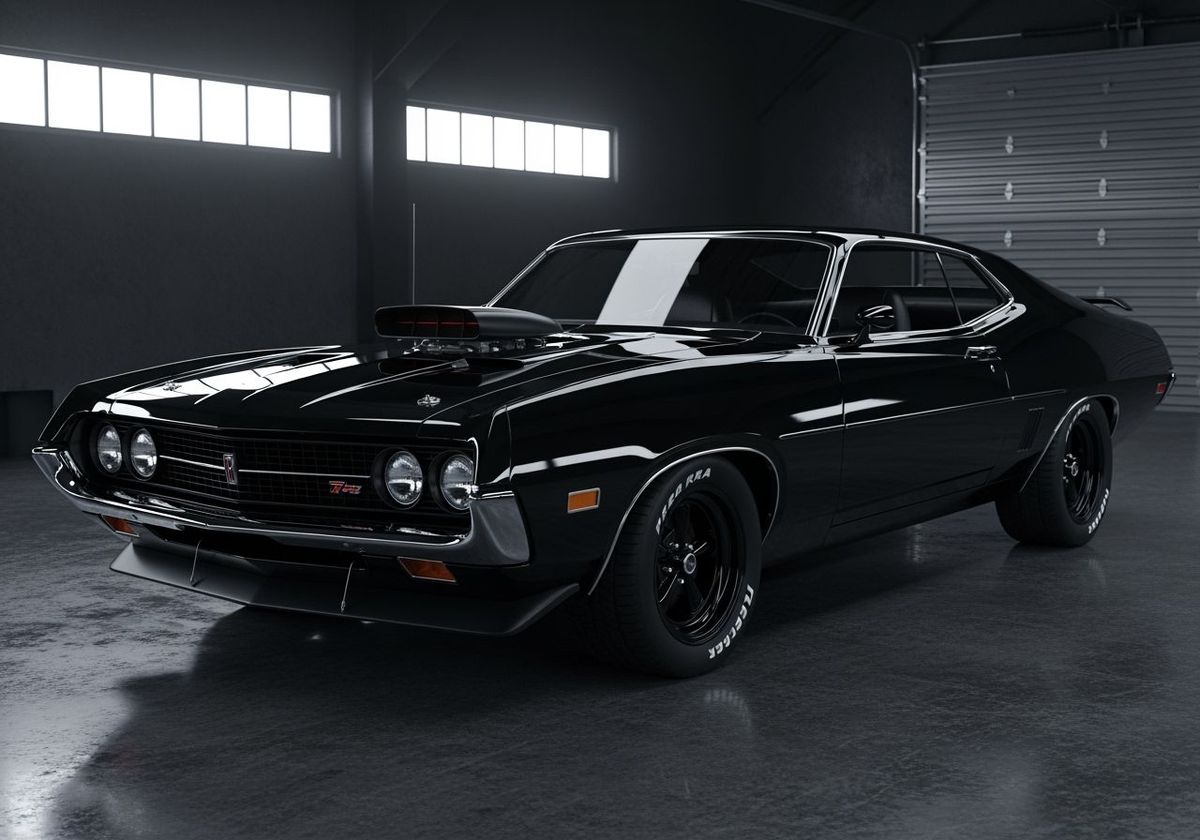 A striking picture of a menacing 1970 Ford Torino Cobra Jet in a dimly lit garage. The menacing muscle car is rendered with sleek, modern design elements and futuristic flair.