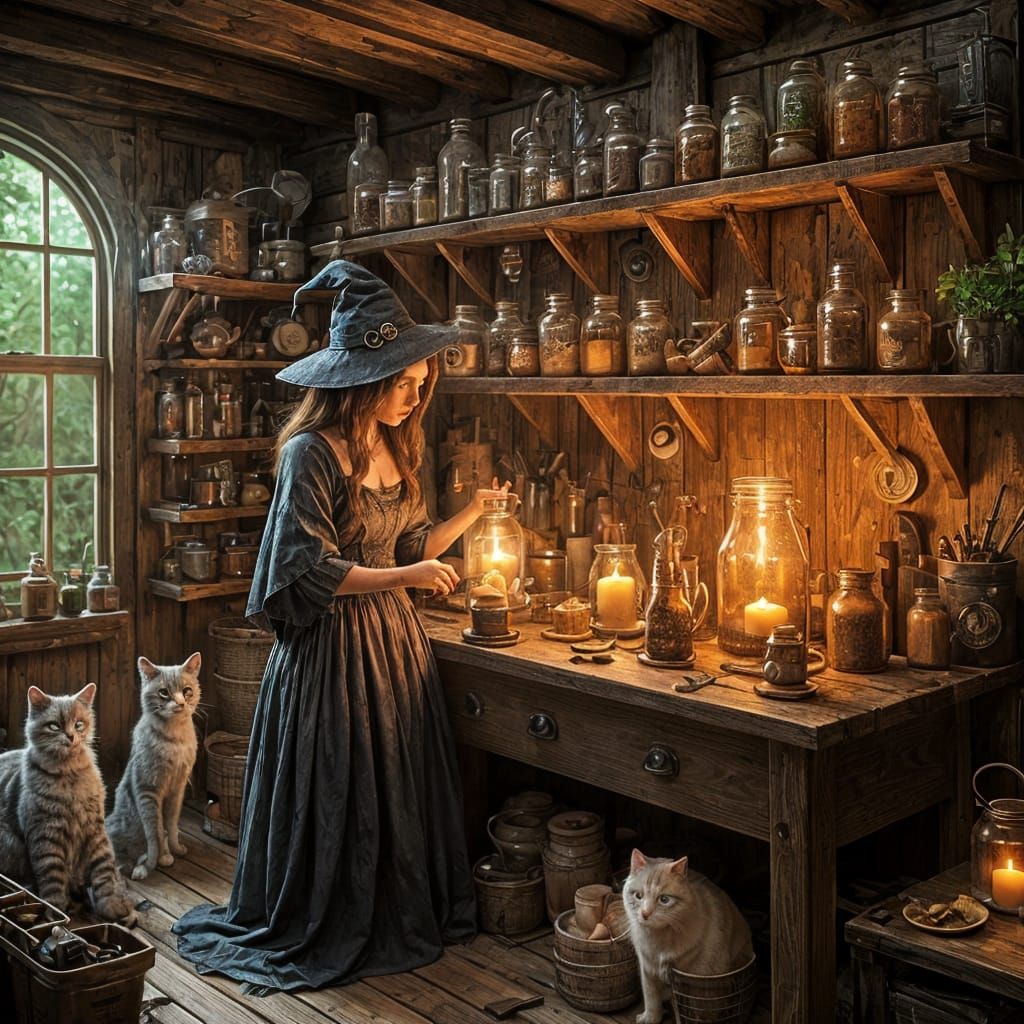 Generate magical cottage witch images with cats, herbs, and potions. Free and easy AI image creation.