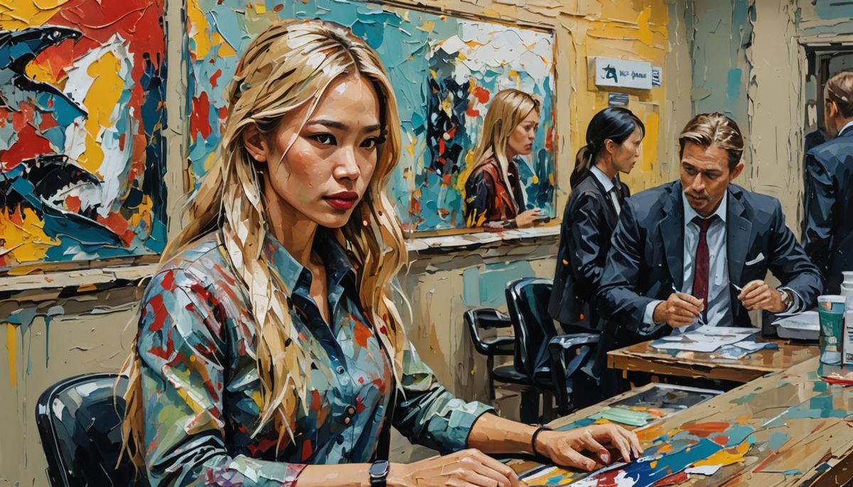This image shows a Vietnamese woman at a bank, rendered as impasto art. The scene features dynamic lighting and a vibrant color scheme. The background is abstract with intricate details.