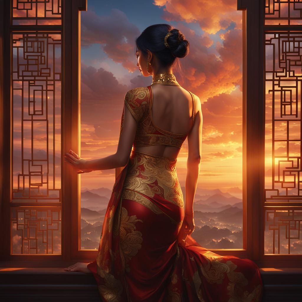 A captivating image of an Asian woman gazing out a window at sunset. The scene is rich with deep colors, soft golden lighting, and a warm color palette, reminiscent of digital matte painting.