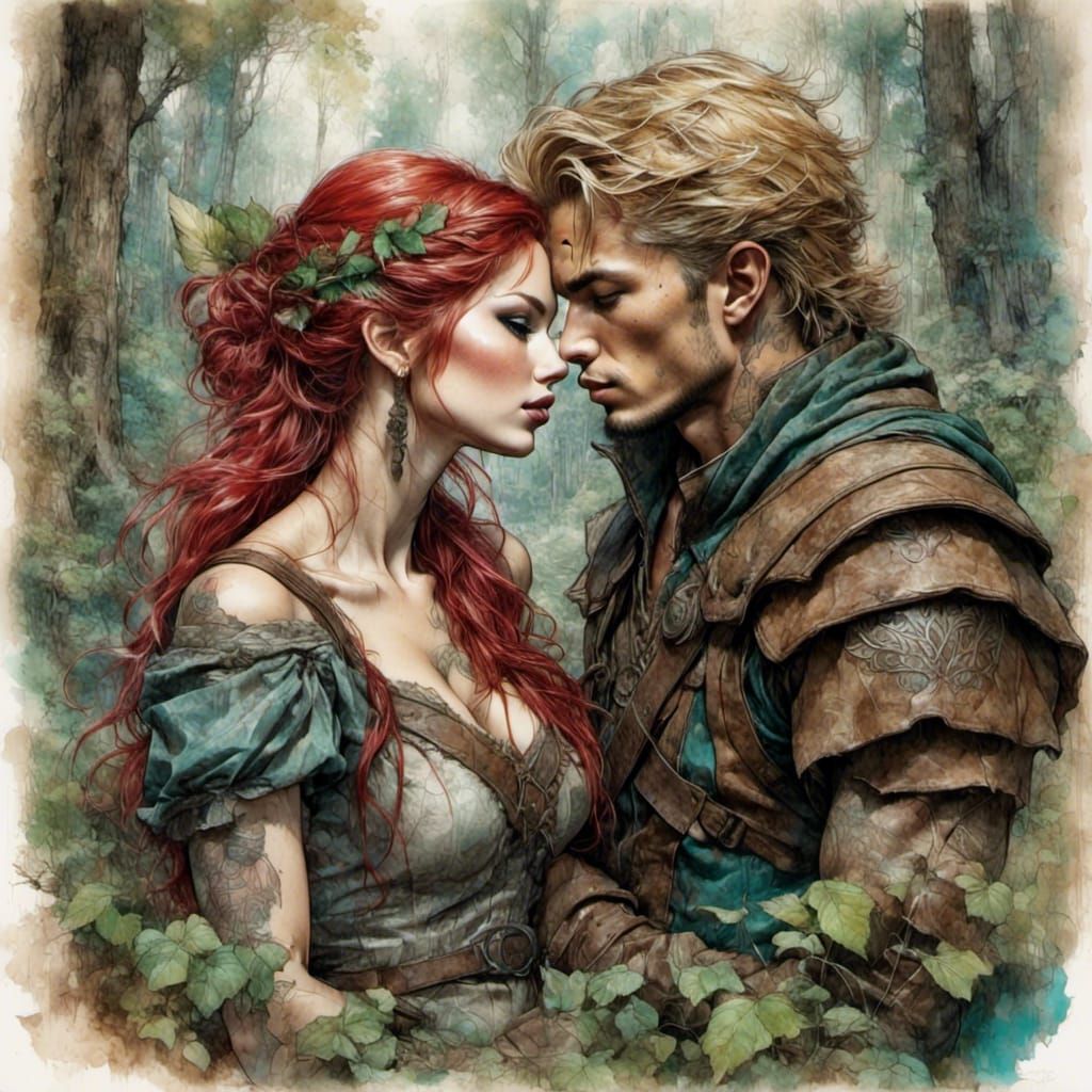 This image shows two elves sharing a kiss in a forest. The watercolor painting depicts a redheaded female elf and a blond male elf in a tender moment.