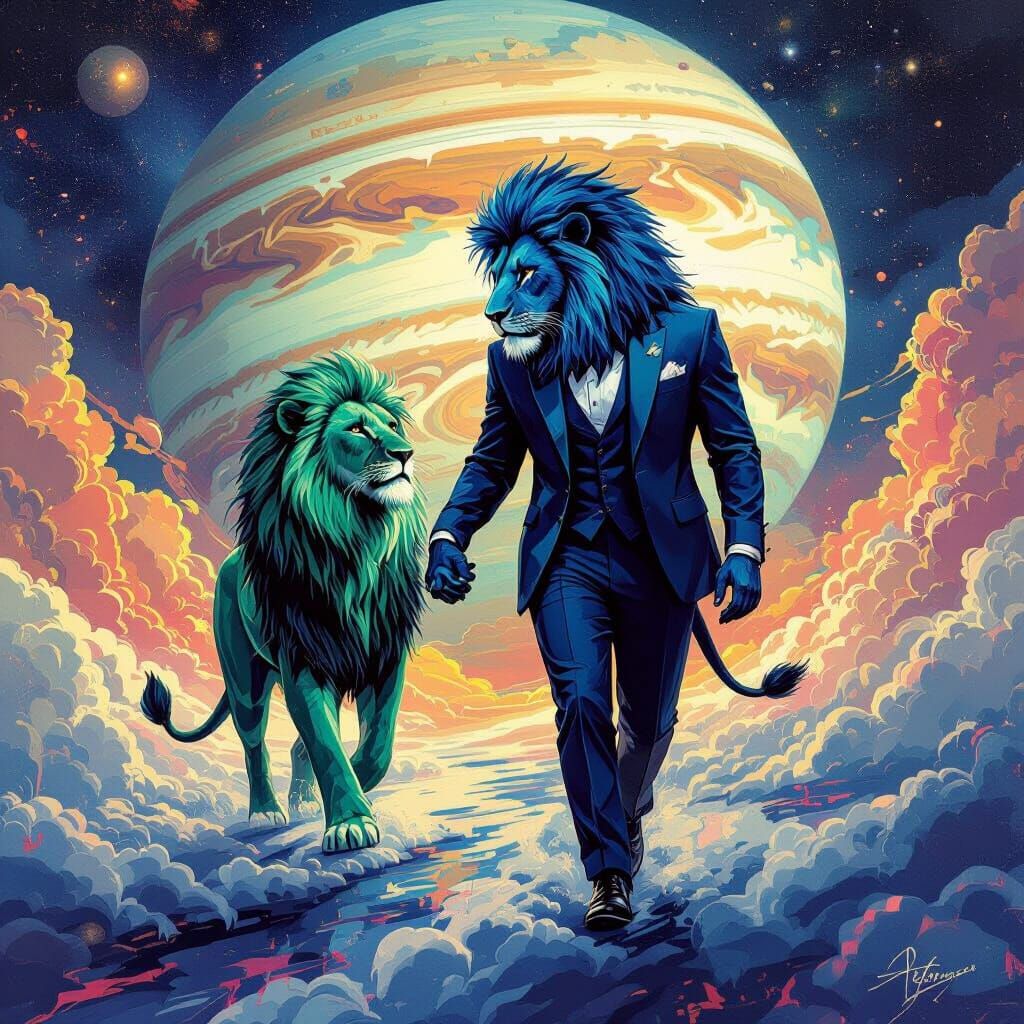 This image depicts two lions, one sapphire blue and the other emerald green, walking together on Jupiter. The artwork features a dynamic graffiti style with bold colors and intricate textures.