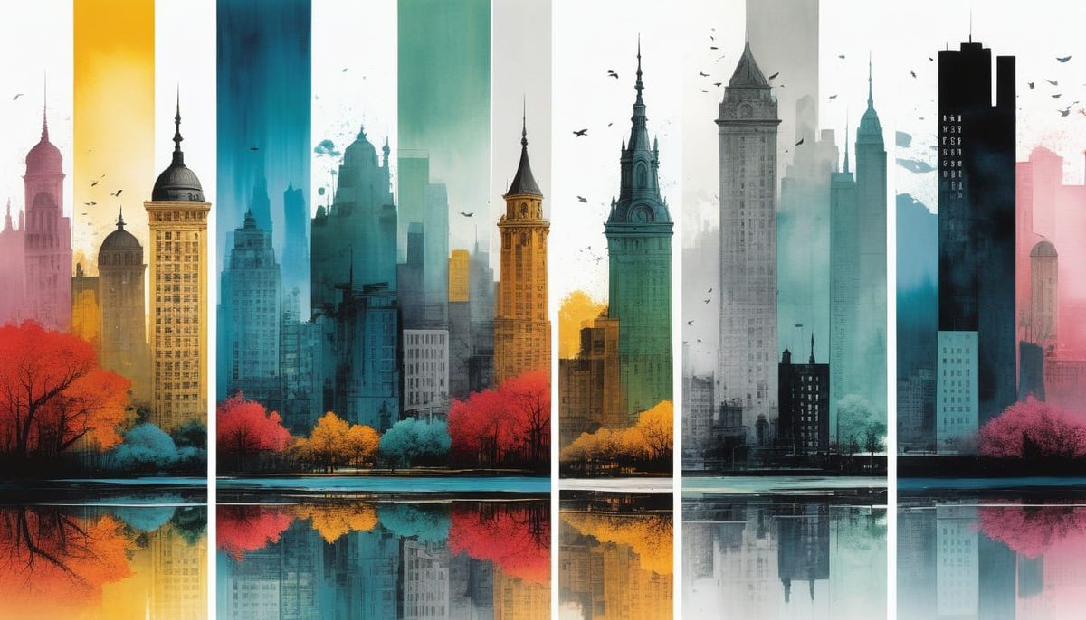 an urbanscape where a change of color palettes is dissecting it into 4 vertical panels to represent 4 seasons, (winter: whites blues silvers grays; spring: greens yellows pinks; summer: blues and yellows; autumn: warm reds, auburns, russets, yellow, golds)