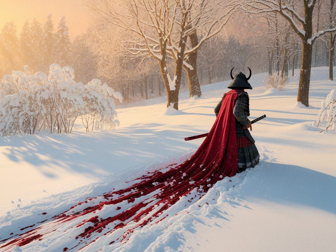 This image shows a lone samurai in a crimson cloak walking through a pristine snowscape. The art style is impressionistic with imperial colors and a magical atmosphere.