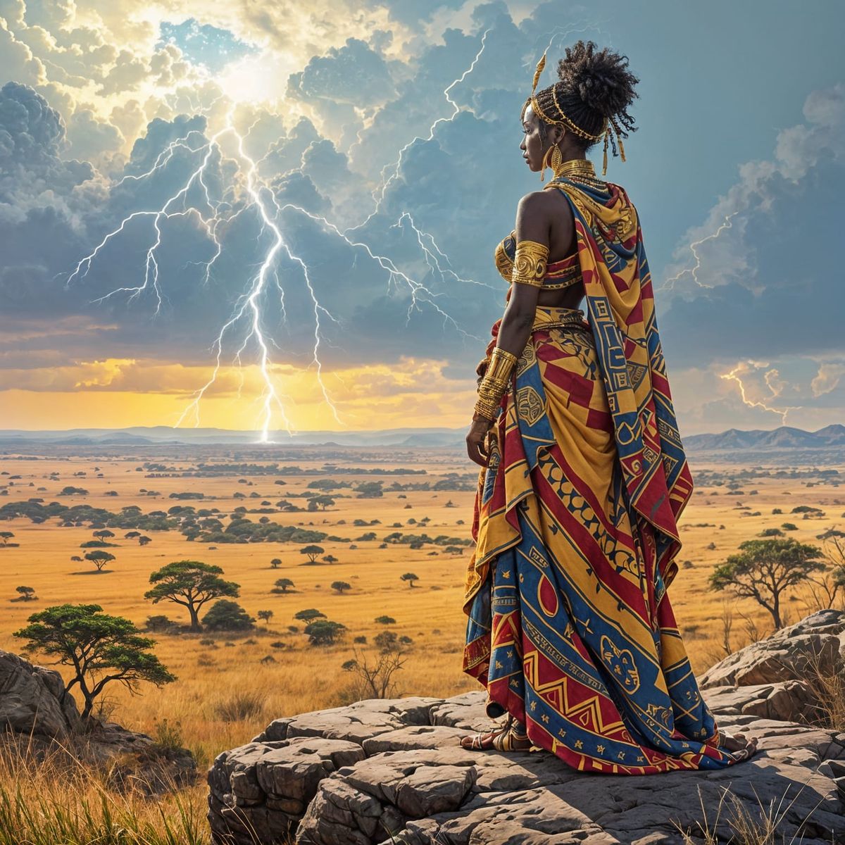 She does not stand above the land. She is its living pulse. In front of her, lightning tears the sky, as if the gods answer her silence. Her skin, kissed by the storm, catches light with quiet nobility. Her garment, woven with ancient symbols, isn’t decoration—it is language. She doesn’t speak. She embodies. The horizon doesn’t stretch before her—it bows. She wears no crown. Her presence is her rule. Her stillness commands more than any throne. She is not queen by title. She is queen by essence.