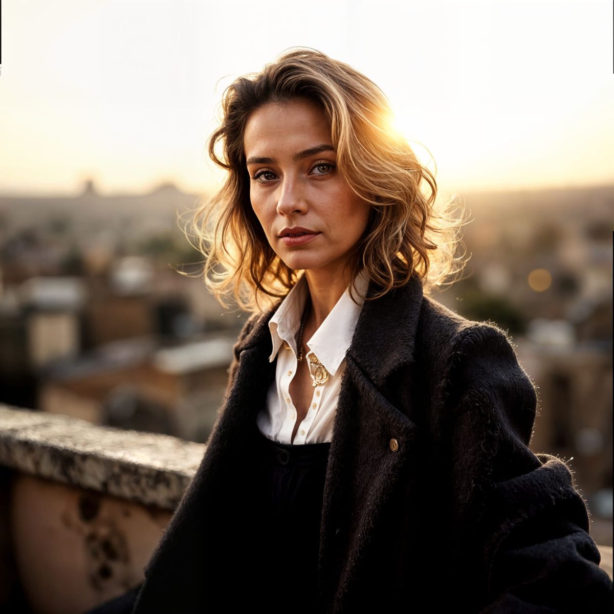 This image shows a woman posing confidently in a rooftop cityscape, surrounded by warm, golden hues of sunset. She wears a white shirt with a high collar and a black jacket, set against a backdrop of muted buildings and soft, natural textures.