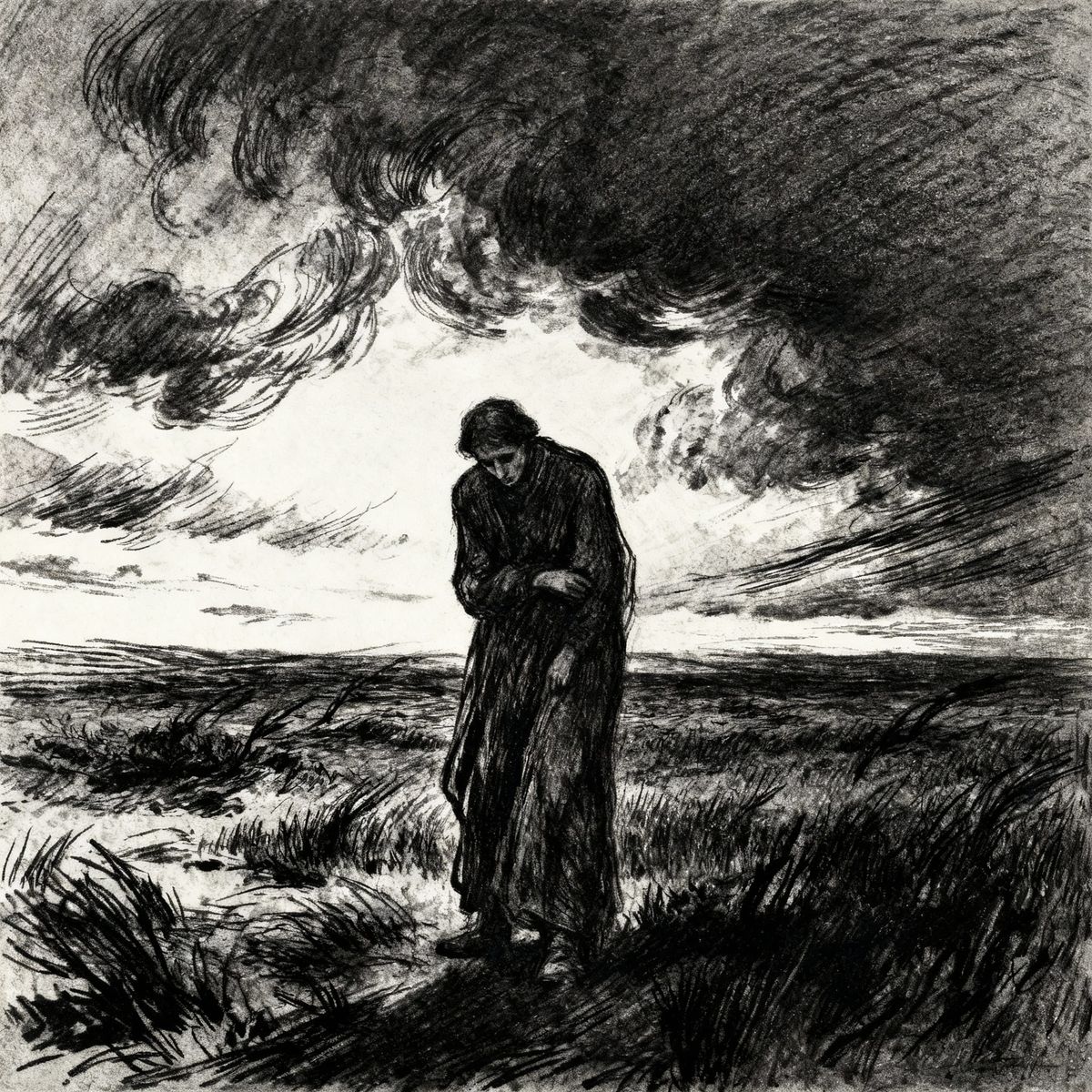 This image shows a striking black and white charcoal painting. A lone figure stands on a desolate moor under a stormy sky, rendered with intense chiaroscuro lighting for a profound sense of isolation.