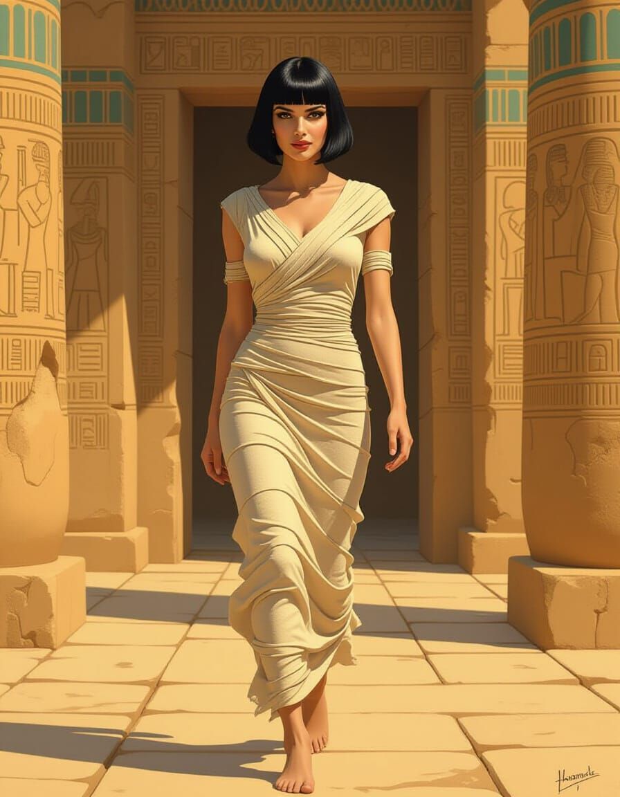 This image shows a young woman with a black bob hairstyle walking confidently. She is wrapped in mummy linens and walking barefoot through an Egyptian castle in a neoclassical style with art deco elements.