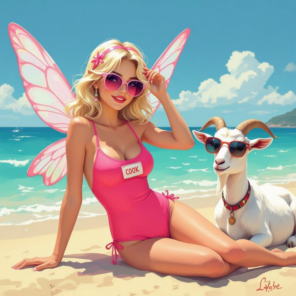 A whimsical image of a blonde woman with fairy wings relaxing on a sunny beach next to a goat. Created in a vibrant and playful artistic style.
