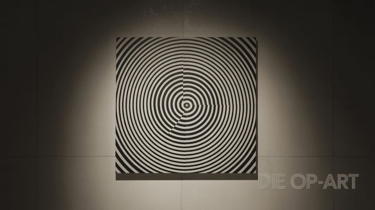 A striking picture of a black and white Op-Art design with concentric circles creating an illusion of depth and motion. Soft lighting accentuates the geometric pattern on a dark gray textured wall.
