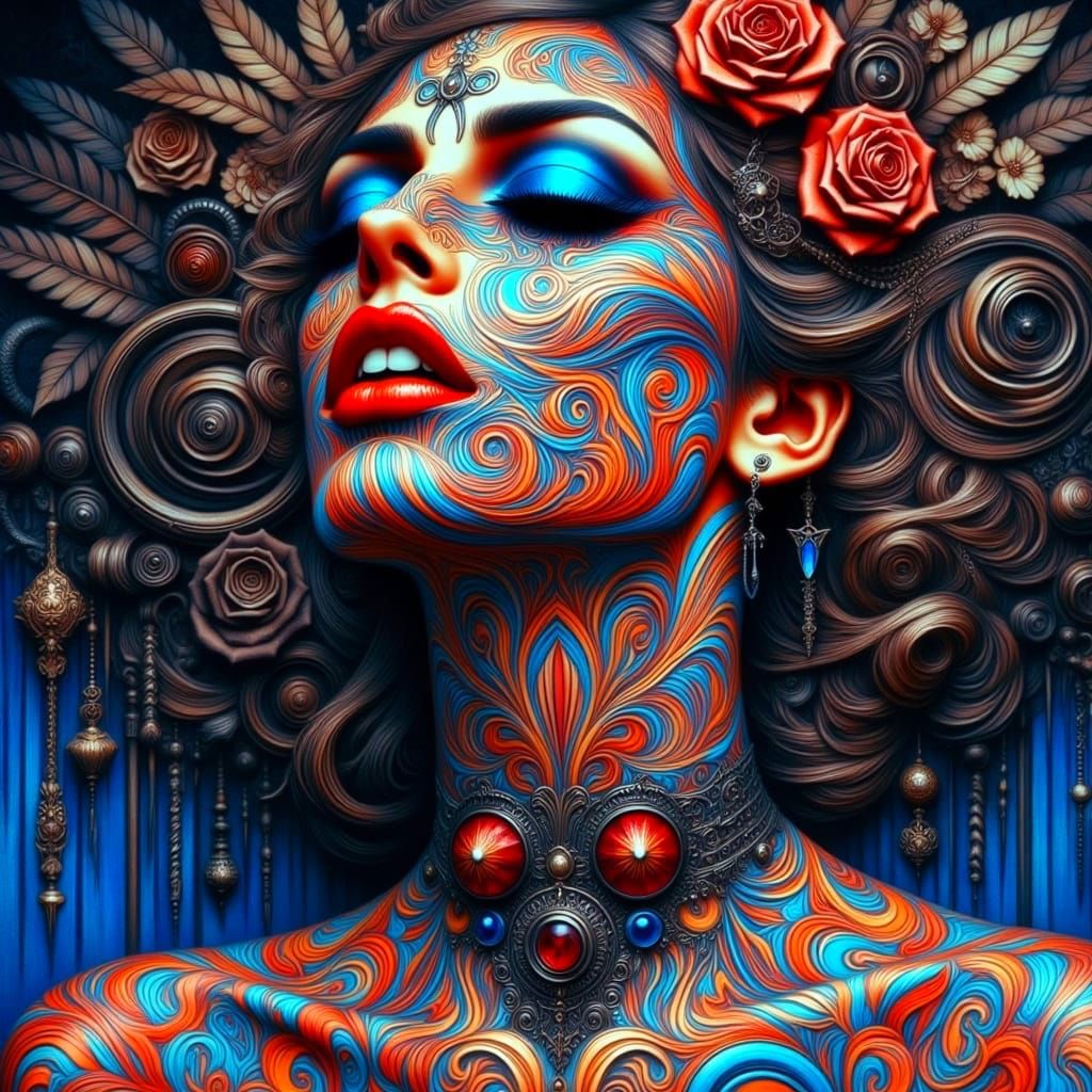 A hauntingly beautiful image of a woman in a state of emotional turmoil, surrounded by swirling stars and surreal dreamscapes, embodying the essence of Romantic Goth and Weirdcore aesthetics.