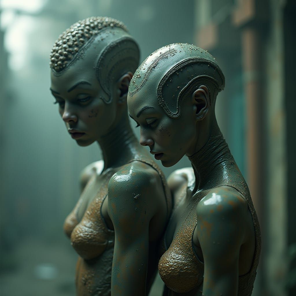 This cinematic image captures an avant-garde, hyper-futuristic alien fashion editorial showcasing a surreal metamorphosis. Photorealistic detail and dramatic lighting create a stunning, atmospheric masterpiece.