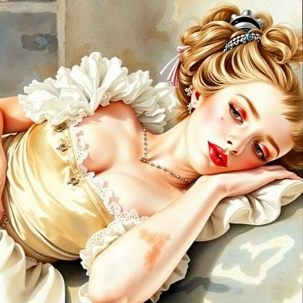 A delicate watercolor of a Rococo woman reclining elegantly. The painting captures the airy, frivolous atmosphere of a boudoir, with diffused light and historically accurate costume details in the style of 18th century painting.
