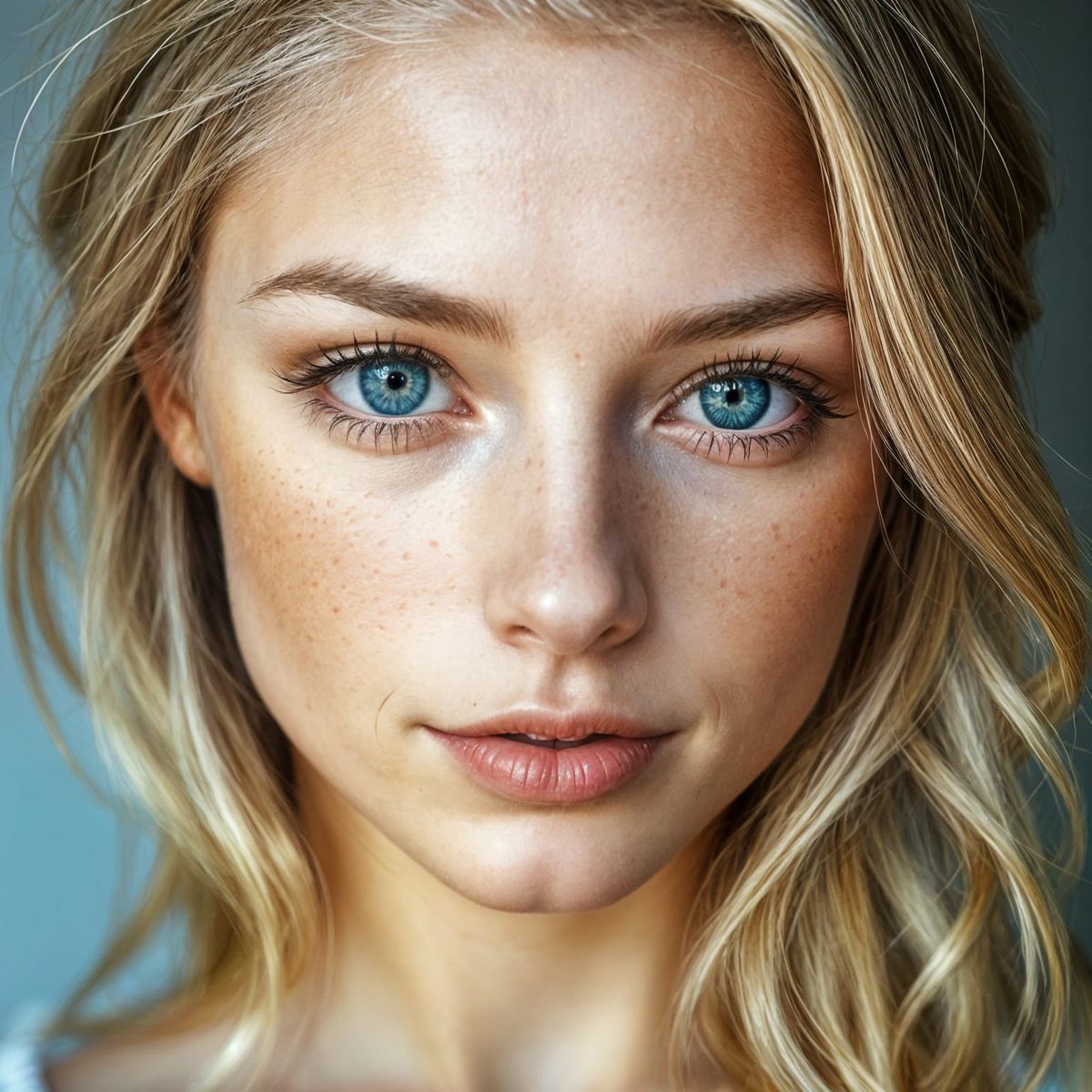 This image showcases a beautifully rendered young woman with symmetrical features, striking blue eyes, and a radiant smile. Created in a photorealistic style, this portrait captures the subject's elegance and charm.