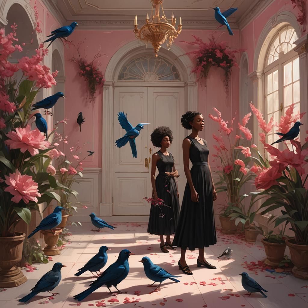 This image shows a Black woman in a black dress holding a blue bird, surrounded by birds and plants. Soft, warm lighting and vibrant blue accents create an elegant, hyper-realistic atmosphere.