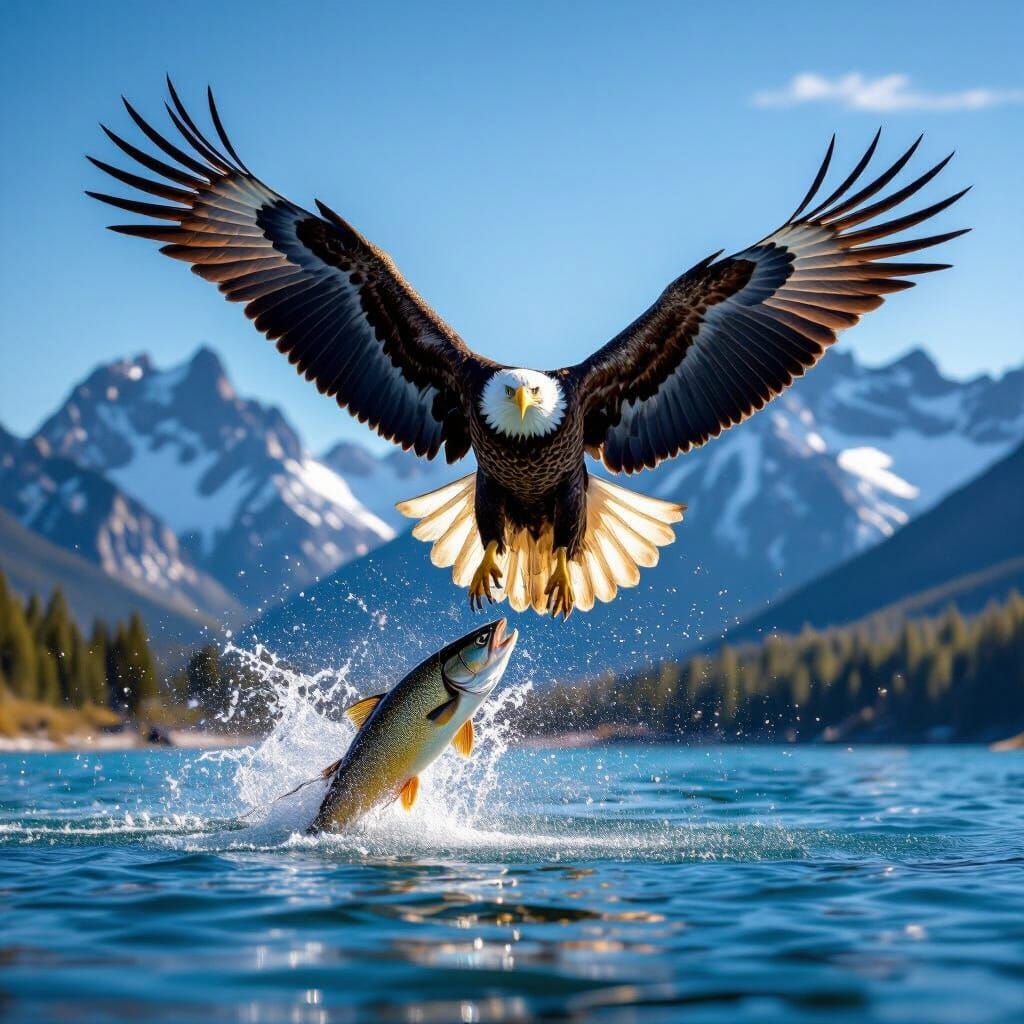 This photorealistic image captures a bald eagle in a dynamic dive, talons extended to catch a fish leaping from a pristine mountain lake. The scene features snow-capped peaks under a clear blue sky, rendered with sharp focus and a shallow depth of field.
