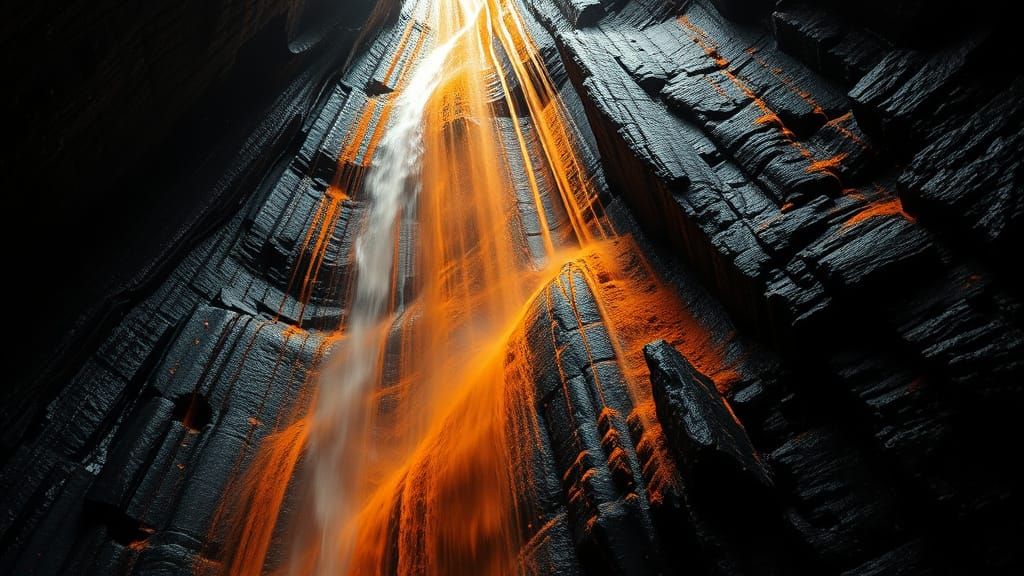 This image shows streams of orange sand cascading down the sharp edge of a dark basalt cliff. A view from below captures the majestic and awe-inspiring scene with hyper-realistic detail.