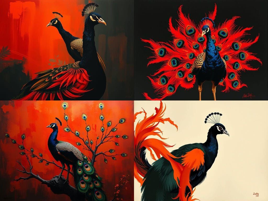 A vibrant peacock rendered in shades of fiery red and deep black. The image evokes abstract expressionism and German Expressionism, with bold color fields and stark contrasts.