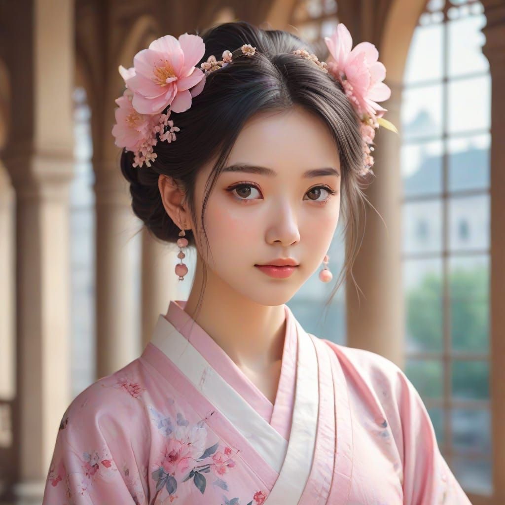 This delicate watercolor portrait captures an anime girl's ethereal beauty, adorned with flowers in her hair and a pink hanfu, set against the serene backdrop of a palace, with soft focus and gentle pastel hues.