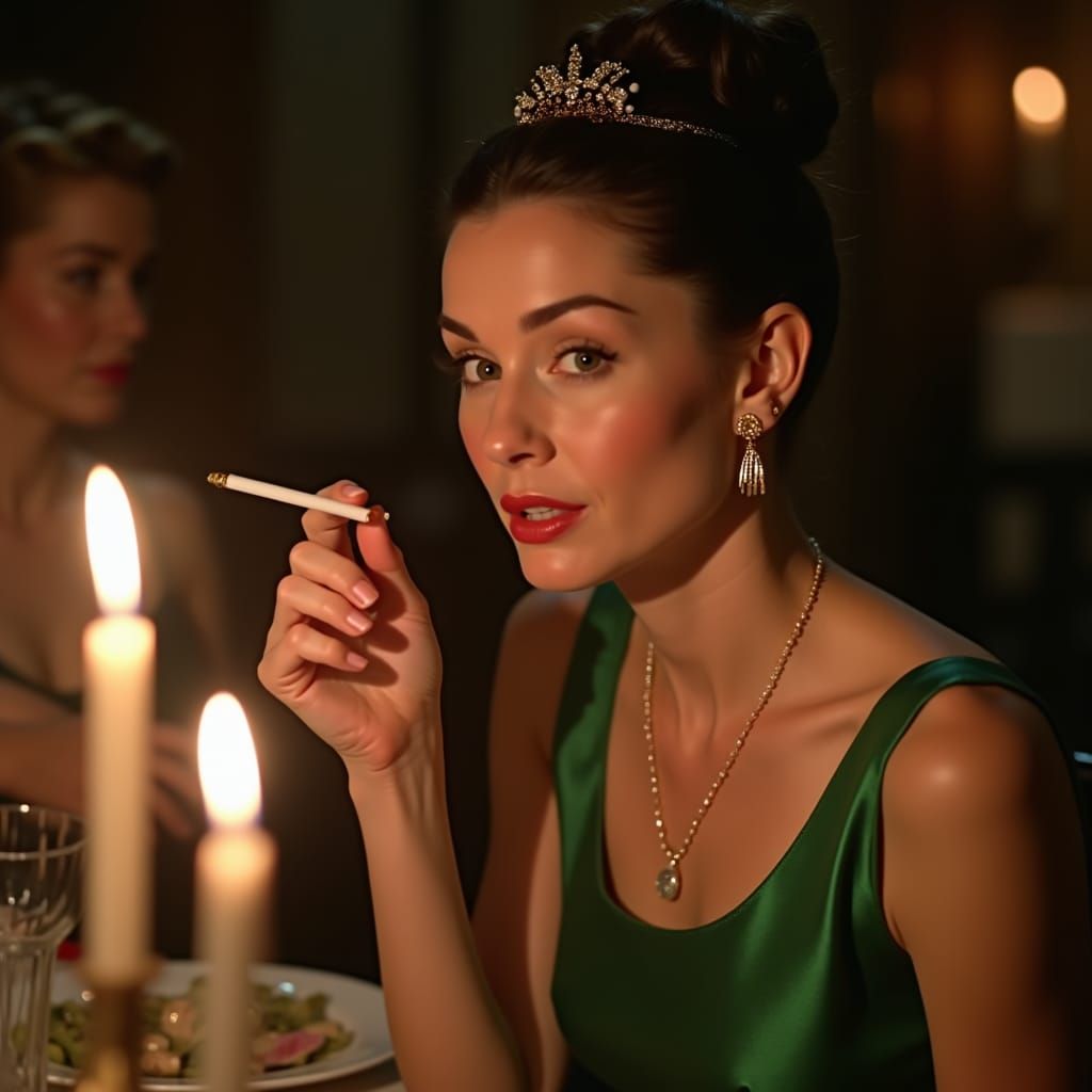 A close-up image of Audrey Hepburn as Holly Golightly holding a cigarette holder. She wears a green satin gown and gazes at a candle flame in this hyperrealistic portrait.